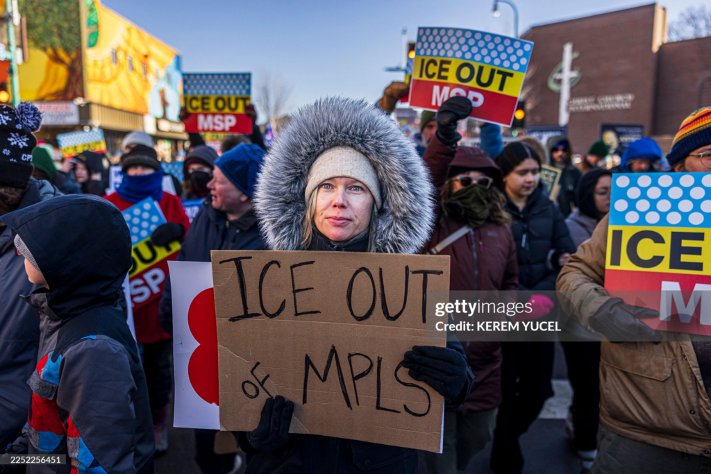 A protester holds an sign as she marches through frigid conditions, with temperatures near 10 degrees Fahrenheit (minus 12 Celsius), in a neighborhood in Minneapolis, Minnesota, on December 20, 2025, where many Somali, Latino and Hispanic immigrants live and work, during the “MN Love Our Immigrant Neighbors – ICE Out of MN!” rally calling for the removal of US Immigration and Customs Enforcement from Minnesota. (Photo by Kerem YUCEL / AFP via Getty Images)